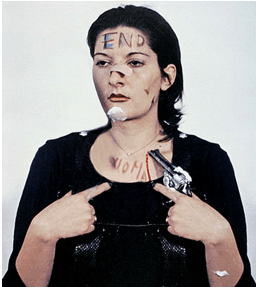 Durante las primeras 3 horas no sucedió mucho. Yo estaba como ausente y hubo escasos gestos sobre mí: darme un beso, taparme con un chal o acariciarme con una rosa. Pero, posteriormente, al cabo de esas tres horas, un hombre cortó mi blusa con una tijera y me dejó el pecho al descubierto. Me movían de posición una y otra vez, como si fuera un muñeco, me clavaron alfileres, me escribieron mensajes en el cuerpo como END (FINAL). Me abrieron las piernas y clavaron el cuchillo entre ellas (en gesto claro intimidatorio, intentando averiguar hasta donde podía aguantar). No me defendí en ningún momento. Si me bajaban la cabeza o me la subían, yo no hacía nada. Alguien me hizo un corte en el cuello y me chupó la sangre. Un hombre bajito se acercó a mi oreja e hizo un gemido muy desagradable, amenazante, metió la bala en la pistola y me la puso en la mano y me apuntó la mano contra la cabeza… luego puso el dedo en el gatillo, pero alguien lo detuvo. A las 02.00 de la madrugada la performance terminó. Yo tenía un aspecto horrible. Estaba medio desnuda, sangrando y mojada por los vasos de agua que también me lanzaron encima. Una cosa que me sorprendió es que al terminar la performance yo me levanté y me dirigí a algunas personas, que huyeron inmediatamente. Mientras estuve como una marioneta para ellos, no hubo problema, pero cuando adopté un papel más activo todos escaparon, evitando así un enfrentamiento real.